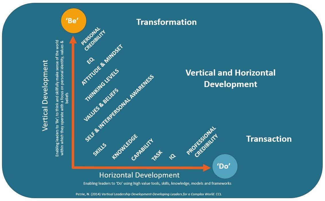 While the Greiner Growth model is meant for organizations, I would contend it is equally applicable to personal and professional development. It fits nicely within the concept of vertical development. Vertical Development is the process of being able to shift mindsets and learn new skills to perform in ever more complex organizations and situations.