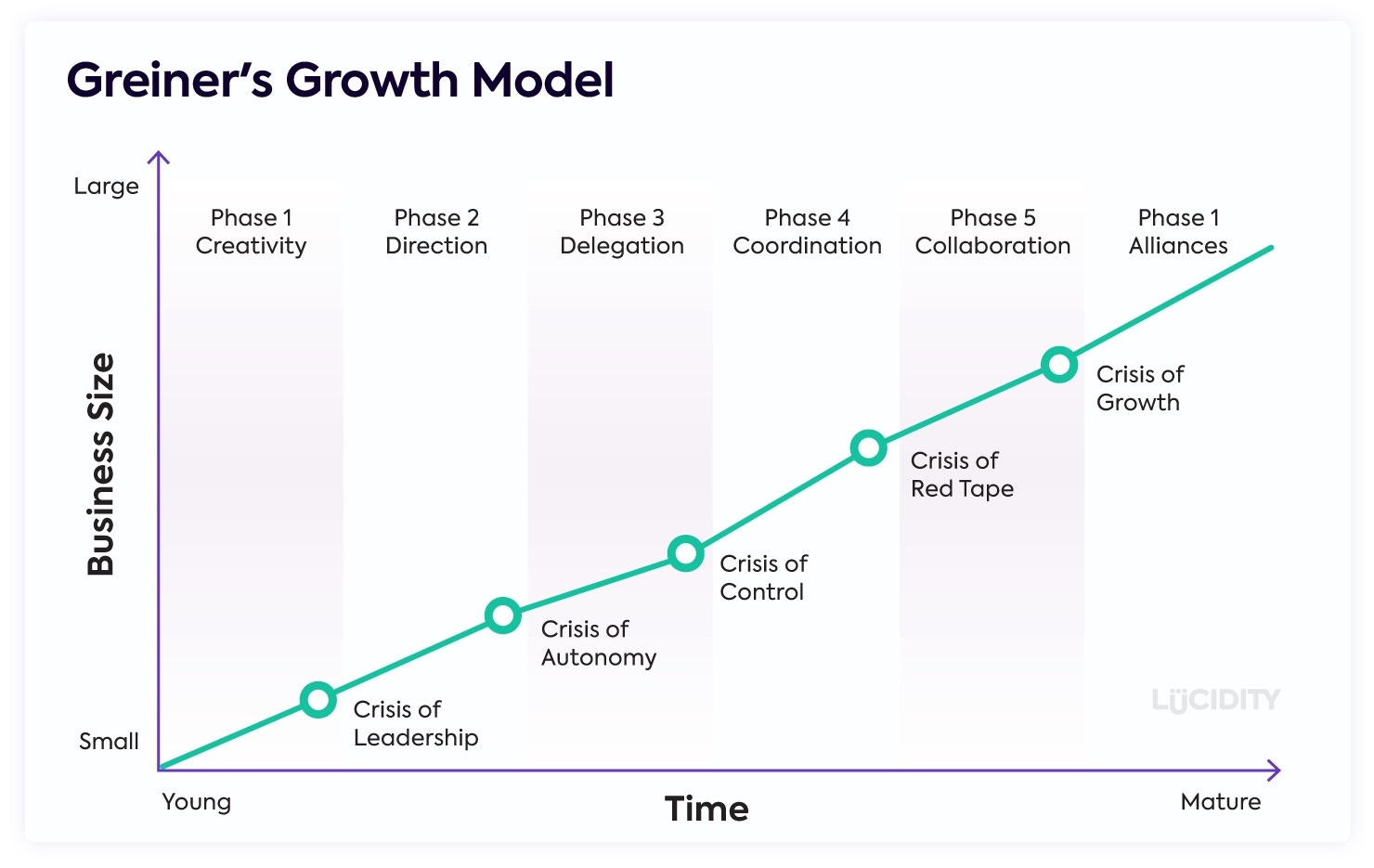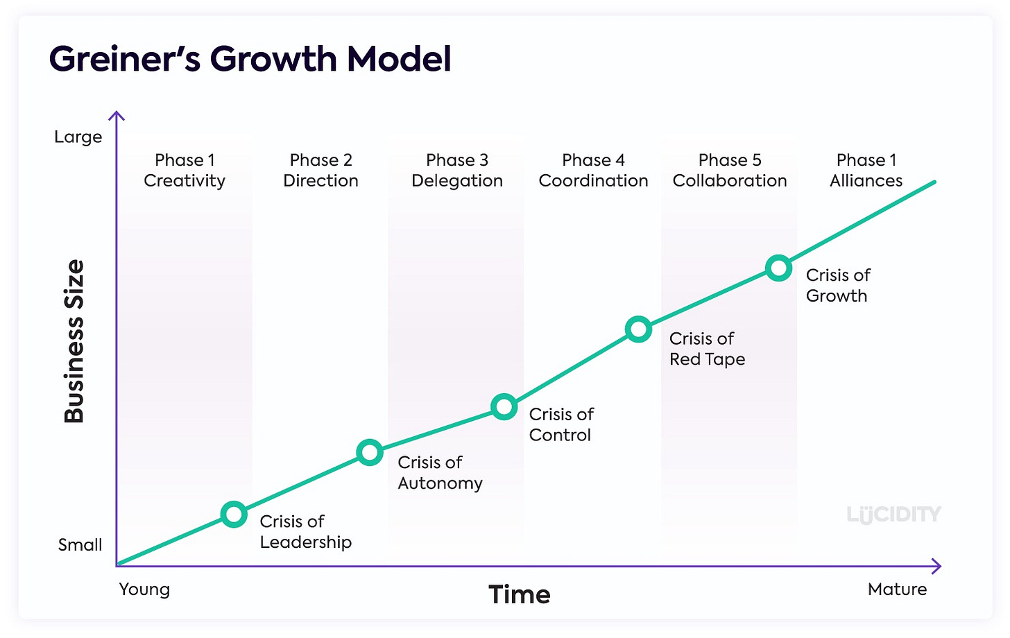 The Greiner Growth model charts business size against time. From small to large and young to mature, organizations take a journey through five phases of growth posed by five leadership crisis challenges.